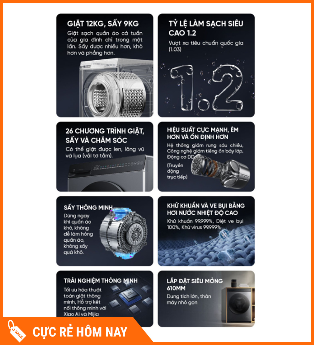 Xiaomi Mijia MJ101 là mẫu máy giặt sấy thông minh cao cấp đến từ hệ sinh thái Xiaomi. Sản phẩm nổi bật với khả năng giặt tới 12kg – sấy 9kg, phù hợp cho gia đình từ 4–7 người. MJ101 tích hợp hàng loạt công nghệ hiện đại như: