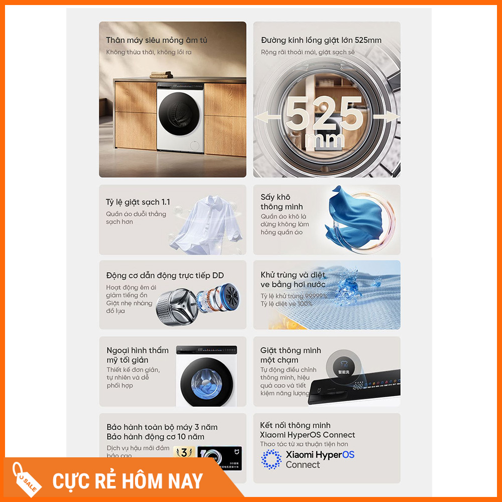 Sản phẩm được đánh giá cao nhờ công nghệ giặt hơi nước diệt khuẩn 99,999%, động cơ DD êm ái, sấy ba chiều, kết nối thông minh qua ứng dụng Mijia – mang đến trải nghiệm giặt giũ hiện đại, an toàn và tiết kiệm.