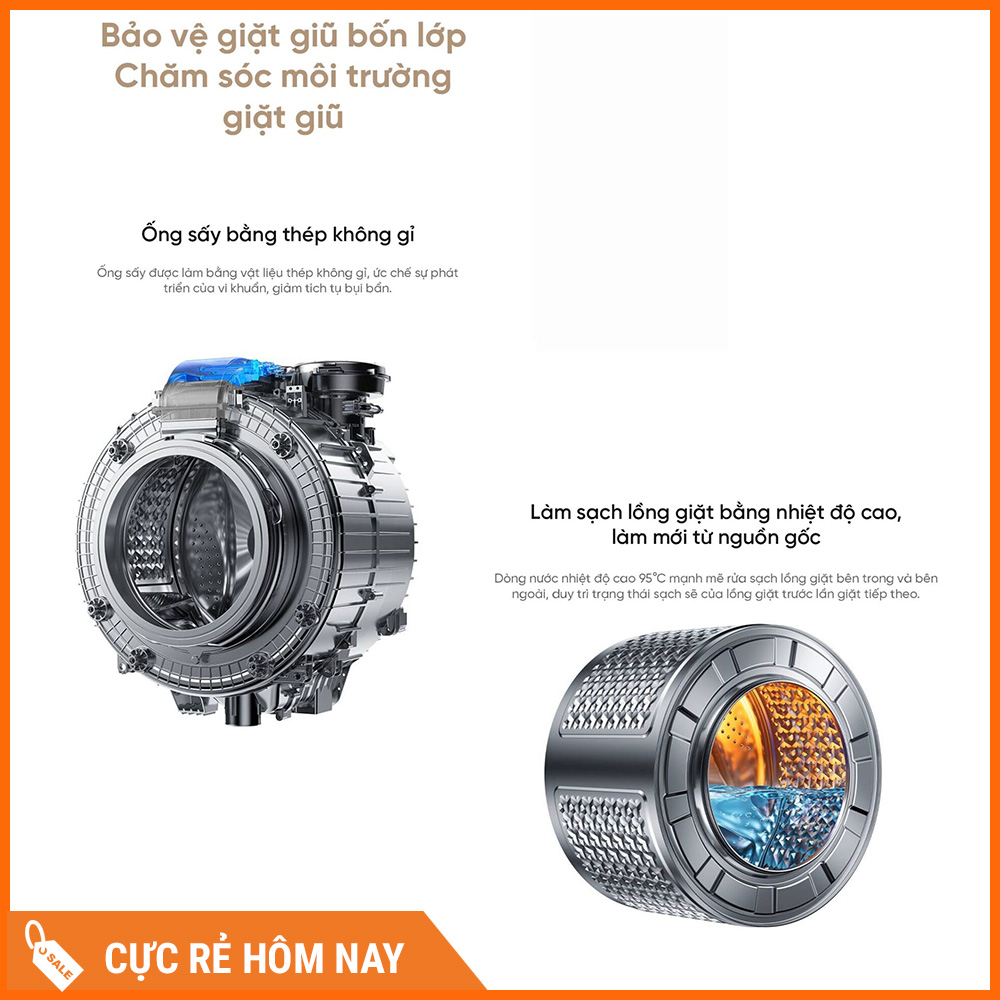 Lồng sấy thép không gỉ: Chống tích tụ vi khuẩn và bụi bẩn, giữ môi trường giặt luôn sạch sẽ, an toàn cho quần áo.