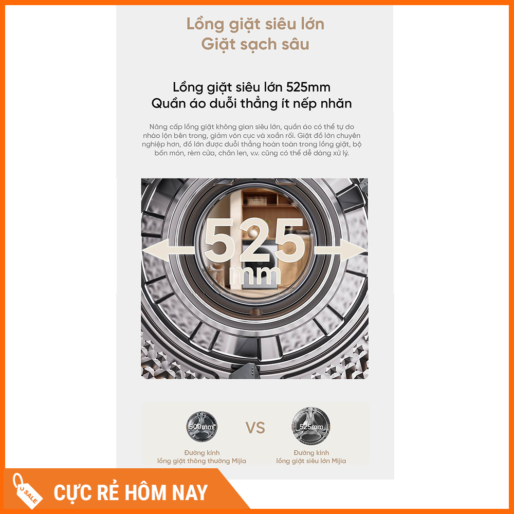 Đường kính lồng giặt lớn 525mm: Giúp xử lý đồ lớn như chăn ga, rèm cửa dễ dàng và giảm nhăn hiệu quả.