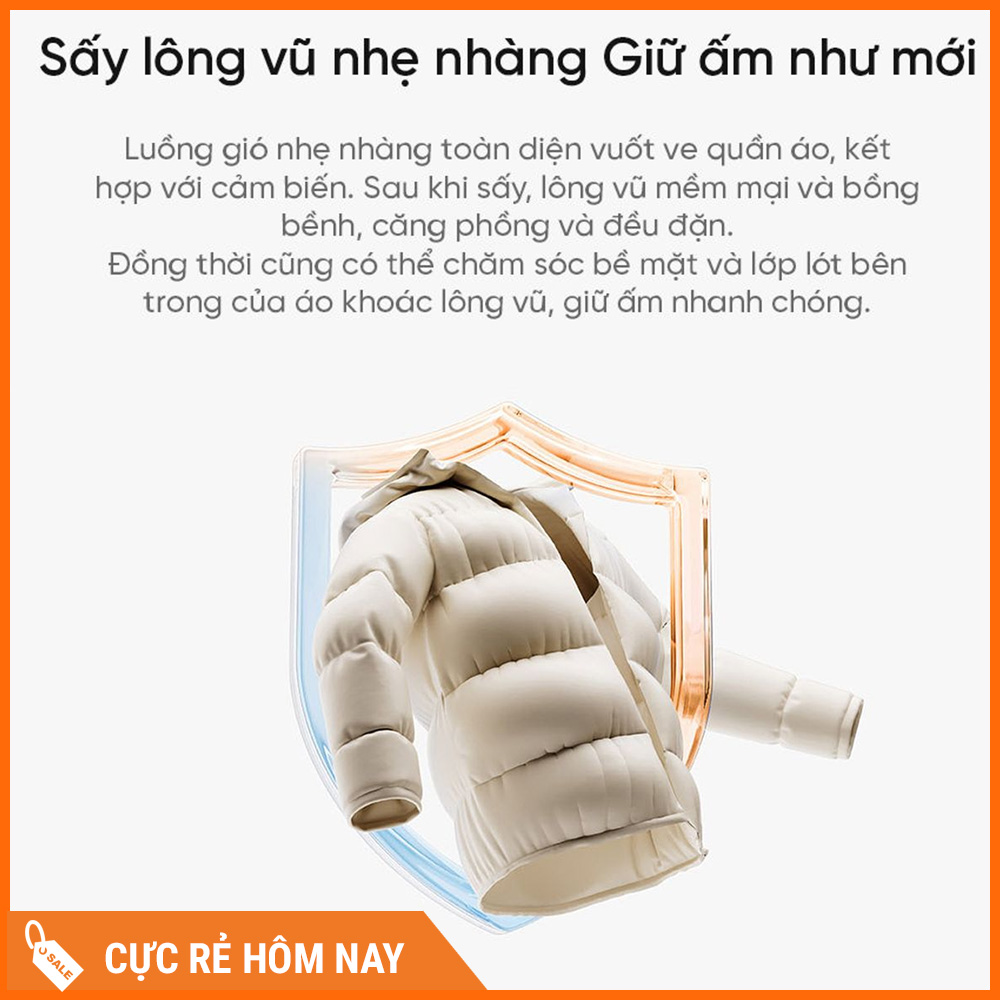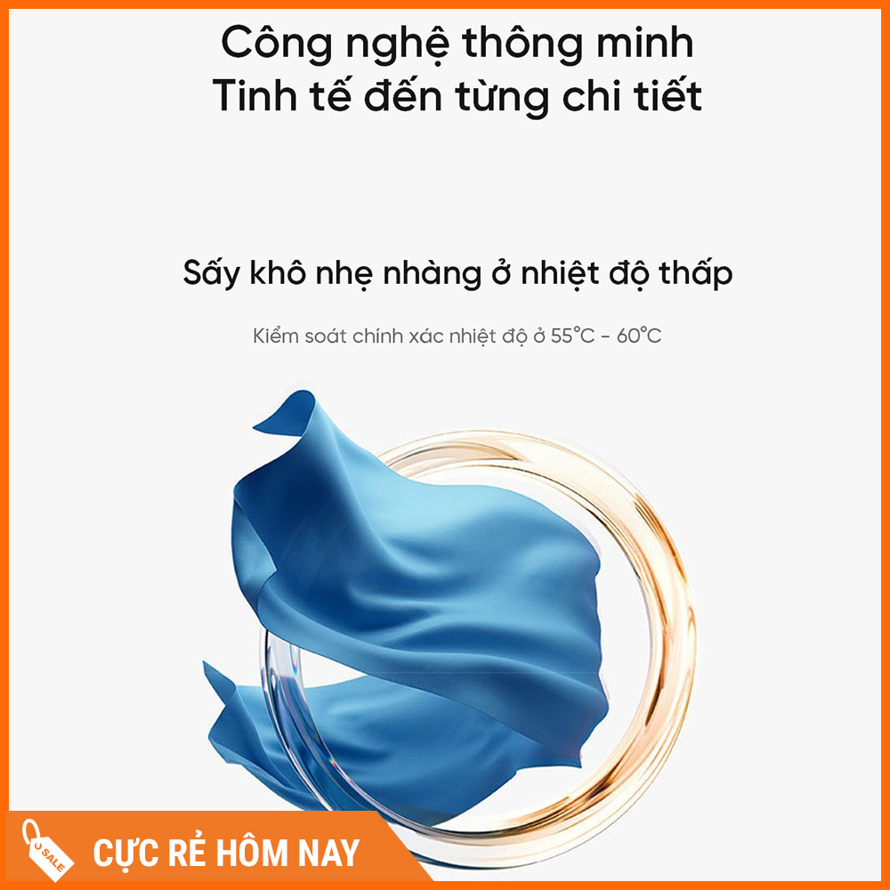 Sấy ở mức nhiệt 55–60°C, phù hợp với hầu hết các loại vải, hạn chế co rút và biến dạng.