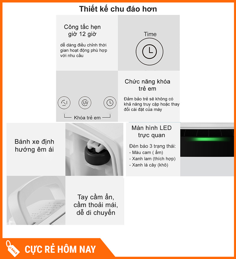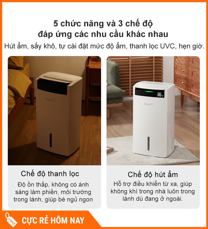 5 chức năng giúp bạn chọn đúng mục tiêu sử dụng: hút ẩm nhanh khi trời nồm, duy trì độ ẩm dễ chịu cho phòng sinh hoạt, hỗ trợ hong/sấy quần áo trong nhà…