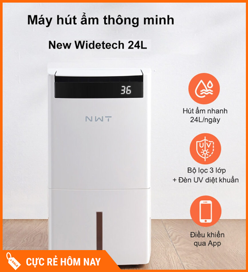 Máy hút ẩm không khí thông minh NEW WIDETECH 24L là lựa chọn dành cho nhu cầu hút ẩm mạnh cho không gian rộng, đặc biệt hiệu quả trong mùa nồm ẩm – mưa kéo dài. Máy giúp giảm độ ẩm nhanh, hạn chế mùi ẩm – nấm mốc, bảo vệ nội thất/đồ da/thiết bị điện tử, đồng thời hỗ trợ hong khô quần áo trong nhà. Phù hợp cho gia đình ở căn hộ lớn, nhà phố nhiều phòng, khu vực phơi đồ kín hoặc phòng có sử dụng điều hòa thường xuyên.