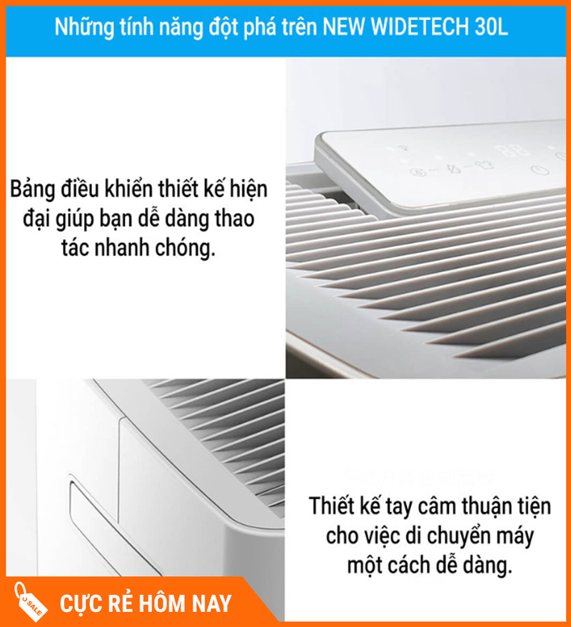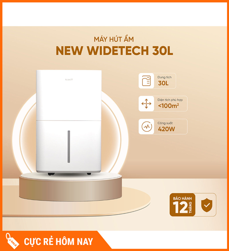 NEW WIDETECH 30L (WDH330EFW1) là máy hút ẩm thông minh dành cho những ngày thời tiết “ẩm bám dai”: nhà bí, sàn ẩm trơn, quần áo phơi trong phòng lâu khô và dễ ám mùi. Thiết bị tập trung vào trải nghiệm gia đình: xử lý ẩm nhanh, vận hành đơn giản, kiểm soát chủ động—phù hợp căn hộ, nhà phố, phòng kín hoặc khu vực thường xuyên phơi đồ trong nhà.