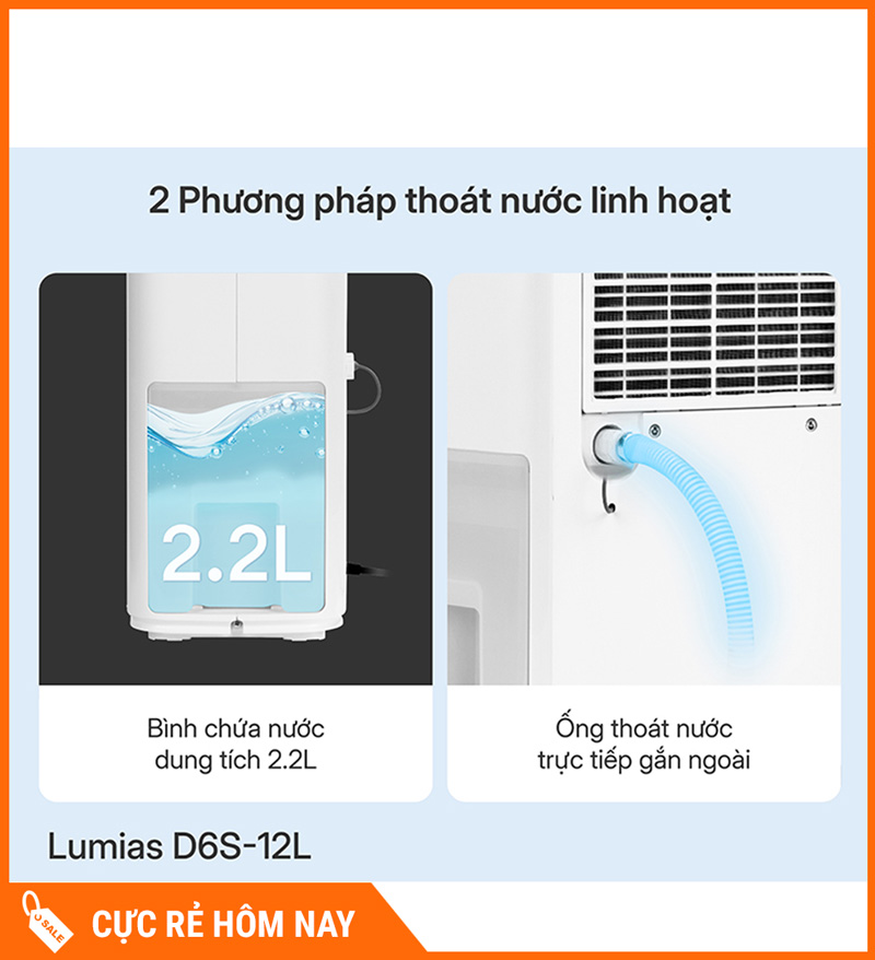 Lumias D6S-12L trang bị bình chứa nước dung tích 2.2L, đáp ứng tốt nhu cầu hút ẩm cho phòng ≤25m². Nhờ dung tích vừa đủ, bạn sẽ ít phải đổ nước hơn trong những ngày ẩm cao, giúp trải nghiệm sử dụng “nhàn” và chủ động hơn.