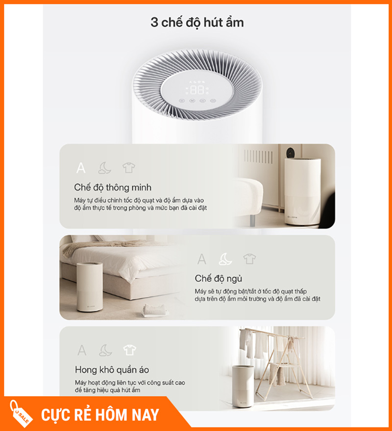 Sấy: tăng cường hút ẩm nhanh, hỗ trợ làm khô không gian/đồ vải khi thời tiết ẩm