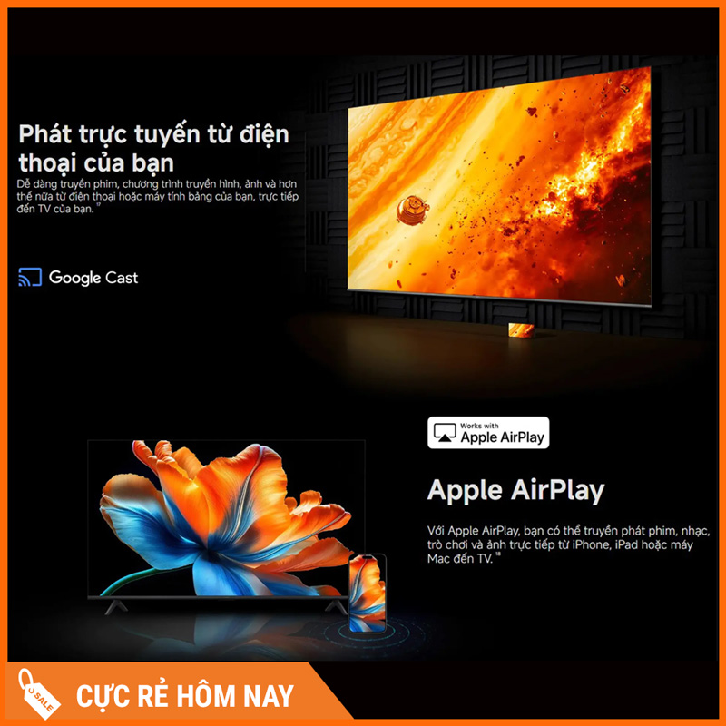 Song song với AirPlay, Google Cast giúp mẫu TV này tương thích tốt với hệ sinh thái Android và nhiều thiết bị khác. Việc truyền nội dung từ điện thoại, máy tính bảng hoặc laptop lên màn hình TV trở nên linh hoạt hơn, phục vụ tốt cho cả nhu cầu giải trí lẫn học tập, làm việc.