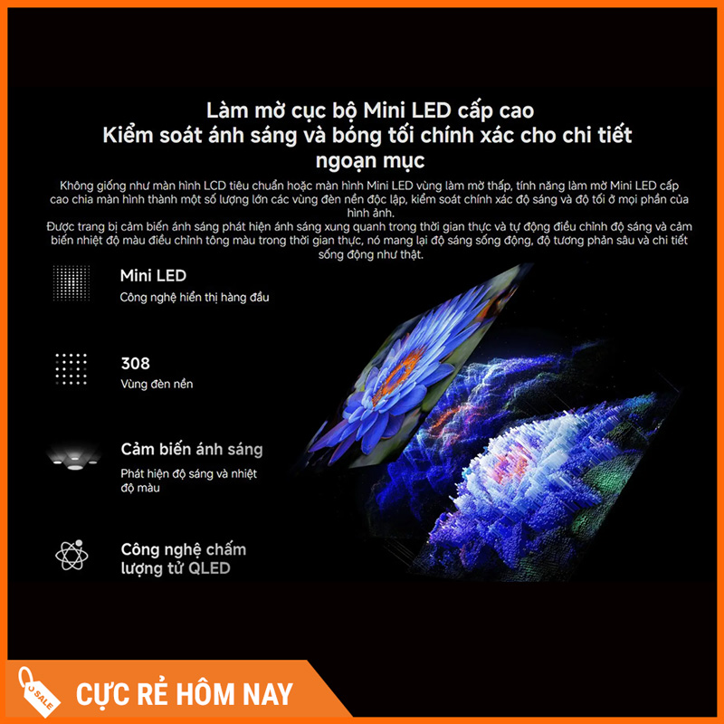 Một trong những nền tảng quan trọng làm nên chất lượng hiển thị của Tivi Xiaomi S Mini LED 55 inch 2026 chính là công nghệ Mini LED với 308 vùng sáng. Việc chia nhỏ các vùng điều khiển ánh sáng giúp màn hình phản hồi tốt hơn với từng khu vực trong cùng một khung hình, đặc biệt khi có sự chênh lệch lớn giữa vùng sáng và vùng tối.