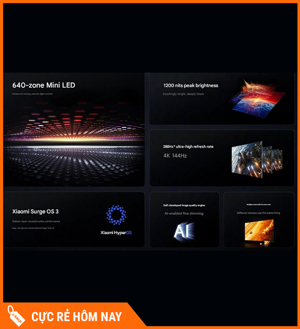 Redmi X85 Mini LED 2026 là chiếc TV 85 inch mới nhất từ thương hiệu Xiaomi, thuộc phân khúc cao cấp, được tích hợp công nghệ Mini LED hiện đại, chuẩn hiển thị Dolby Vision Gaming, tốc độ làm mới lên đến 288Hz và hệ điều hành HyperOS 3 mượt mà. Với thiết kế viền mỏng tinh tế, hiệu năng mạnh mẽ và hàng loạt công nghệ hiển thị tiên tiến, sản phẩm hướng đến người dùng đang tìm kiếm trải nghiệm xem đỉnh cao – từ giải trí đến chơi game, từ gia đình đến doanh nghiệp.